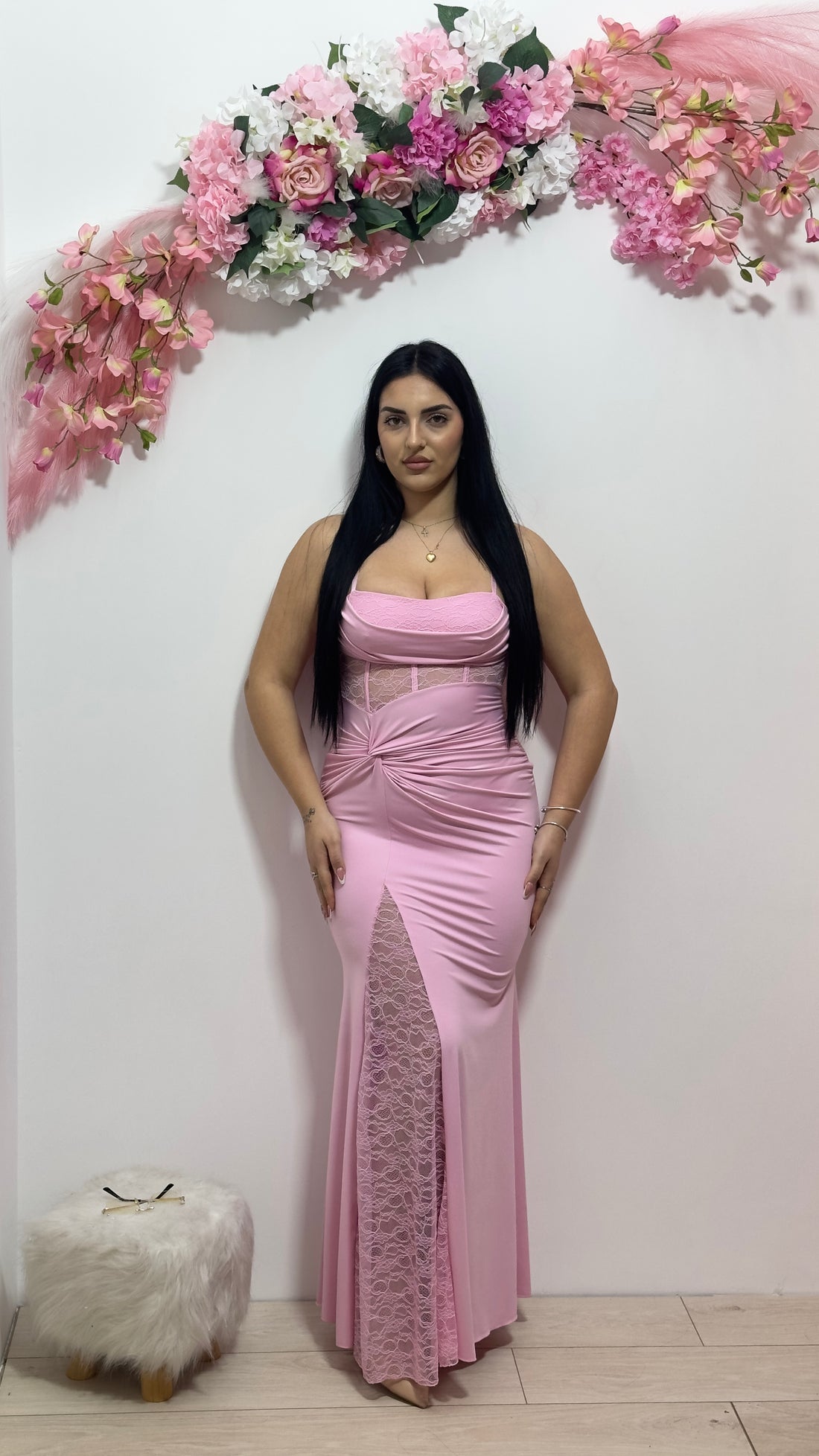 Abito con corsetto in pizzo con scollo a cuore e spalline sottili. Presenta una lavorazione semitrasparente...