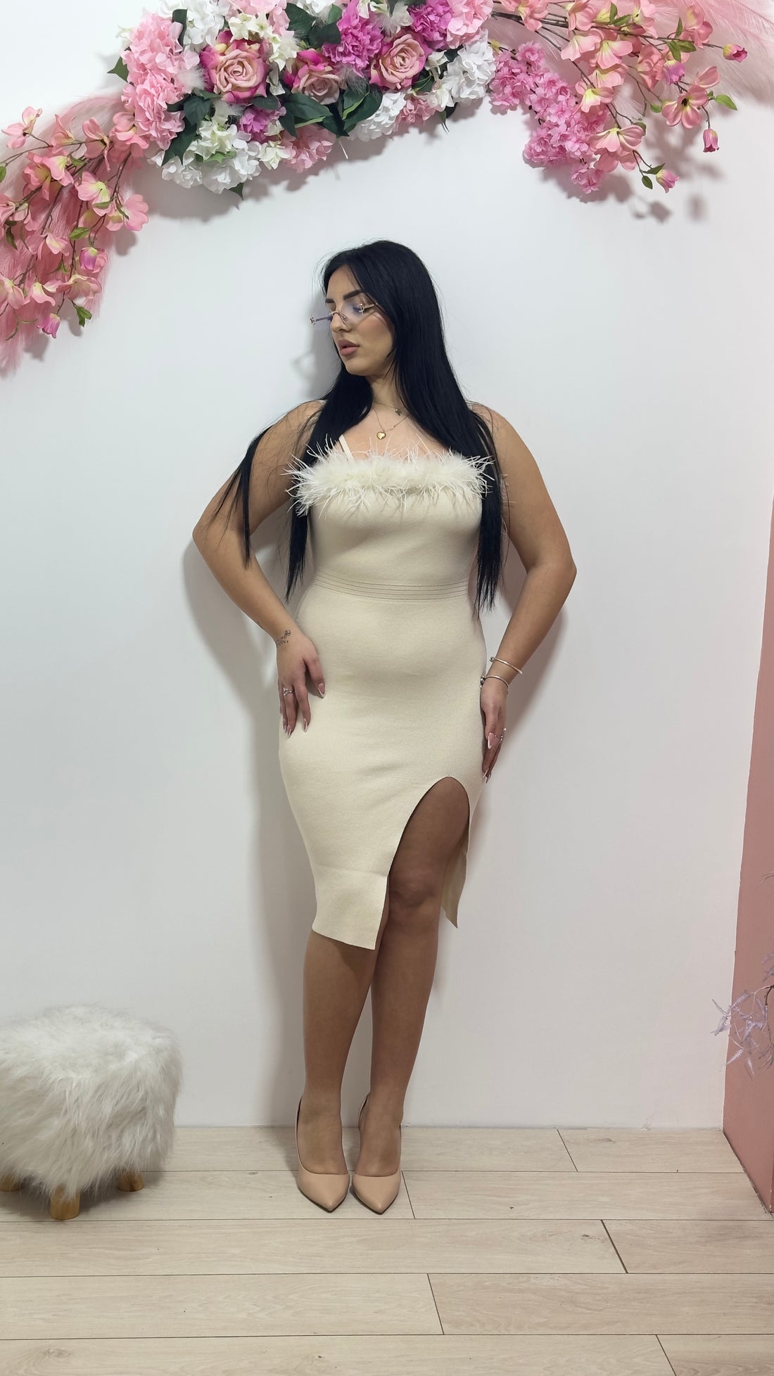 Abito midi, in tessuto a maglia. Lo scollo è impreziosito da piume in tinta. La...
