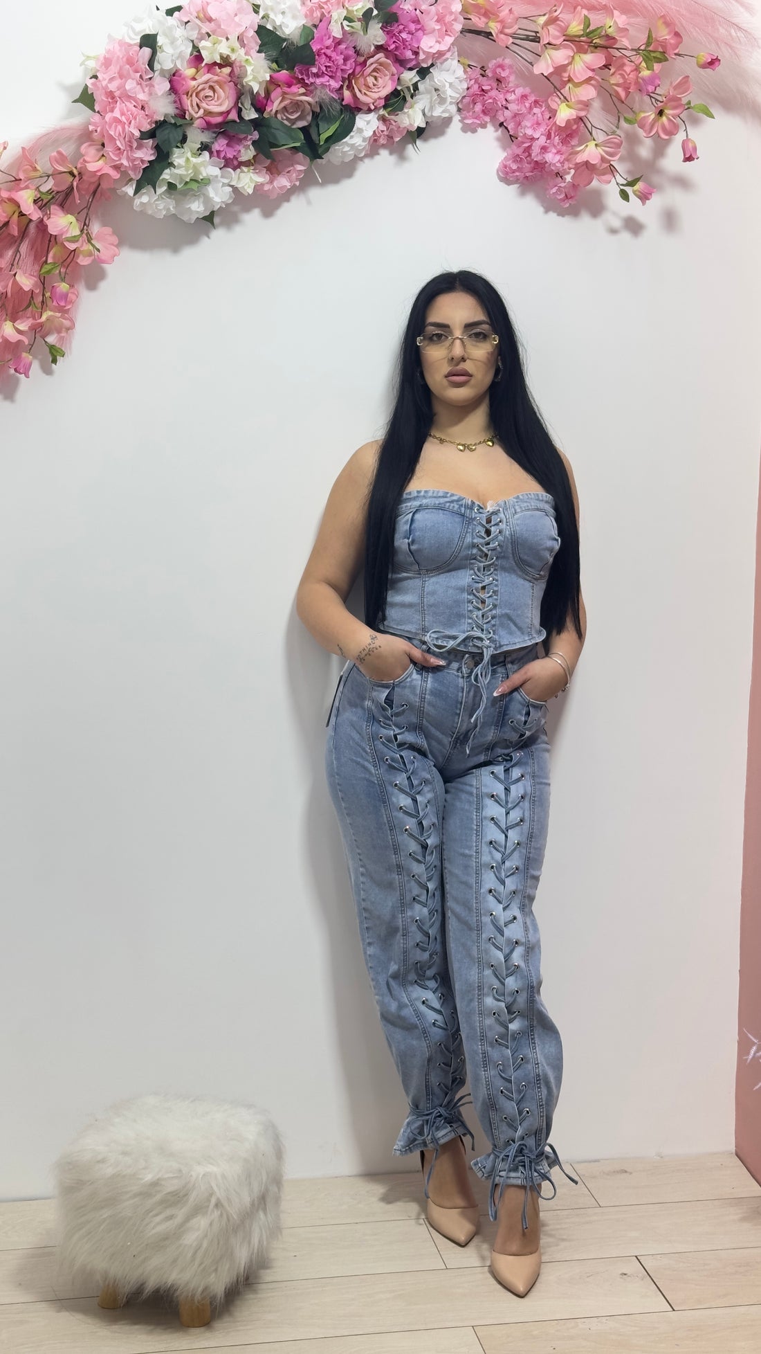 Questo set due pezzi è realizzato in un denim lavaggio medio con finitura elasticizzata, progettato...