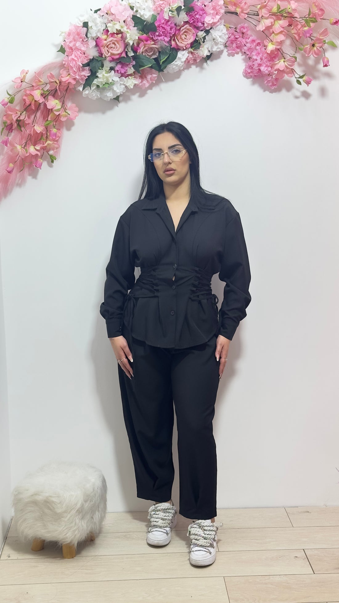 Coordinato a tessuto leggero e semitrasparente. La blusa Presenta un elegante collo alto arricciato con piccoli...