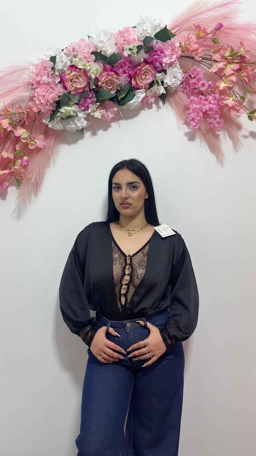 Realizzato in un tessuto fluido dall'effetto satinato/lucido che dona una lucentezza lussuosa alla silhouette.La scollatura profonda a V è impreziosita da un inserto centrale in pizzo floreale semitrasparente. è decorato con una fila di bottoncini rotondi coordinati .Le maniche sono ampie e morbide, leggermente a palloncino, terminando con dei polsini alti in pizzo richiamando il dettaglio sul petto.Scollatura a V profonda che slancia la figura, bilanciata dalla trasparenza vedo-non-vedo del pizzo.